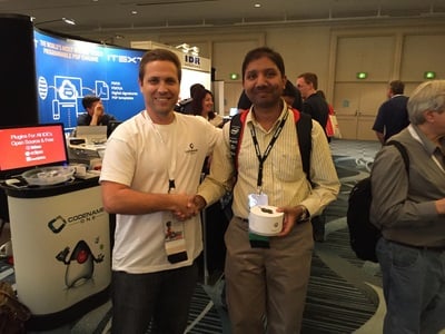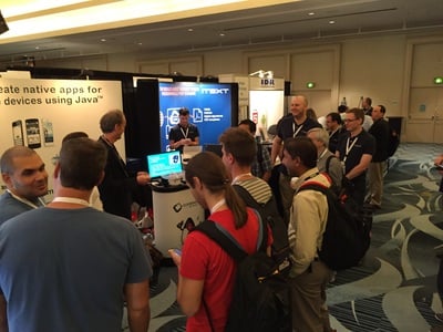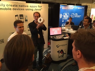 Since the booth work was so busy we don’t have that much pictures other than this one taken by Geertjan (on the left you see Chen, Steve Hannah & me), we did give away all of the suitcase load full of shirts and brochures we brought to JavaOne and we also had a raffle to win a Moto 360 smartwatch Geertjan graciously did the name draw among the contestants and Chen handed the watch to the winner, in all the excitement we completely forgot to write down his name or details but we have his picture and the draw below.